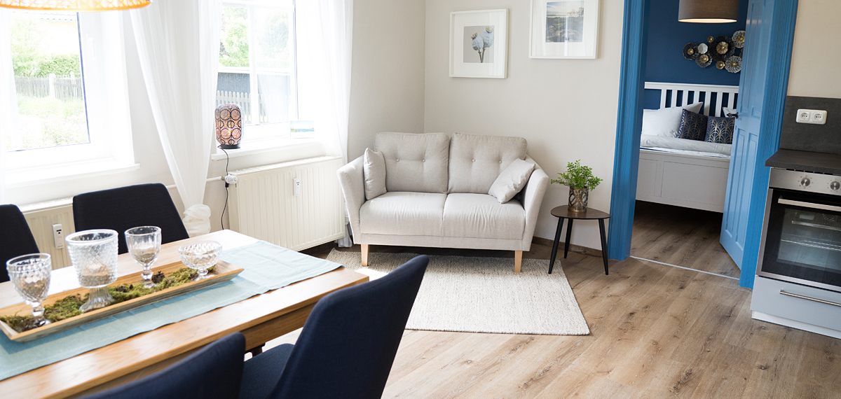 Die liebevoll eingerichtete Ferienwohnung AQUAMARIN befindet sich im Erdgeschoss unseres Hauses GlücksStein und bietet Platz für 4 Personen.