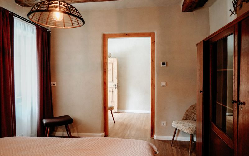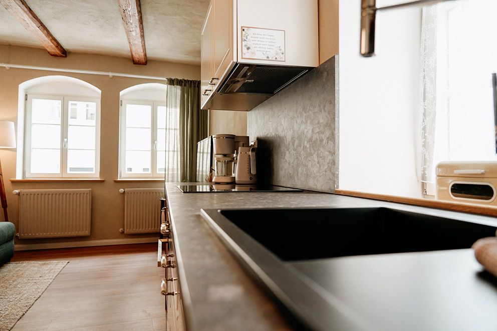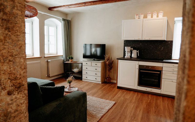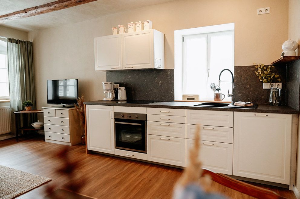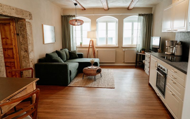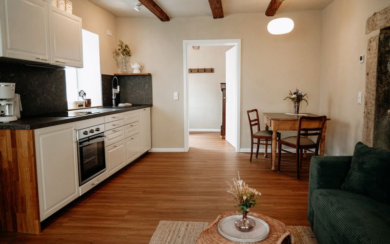 Die ehemailige Gaststube wurde in einen hellen Wohnraum mit Küche umgestaltet, warmes Holz und massiver Sandstein eine harmonische Einheit bilden und eine einladende, beruhigende Atmosphäre schaffen.