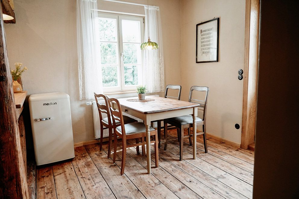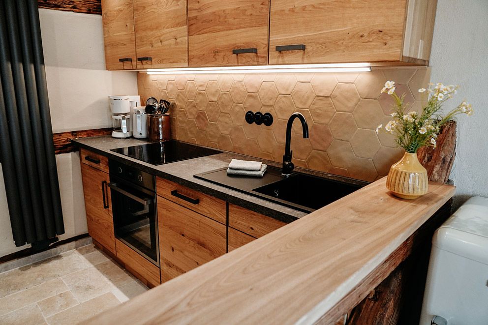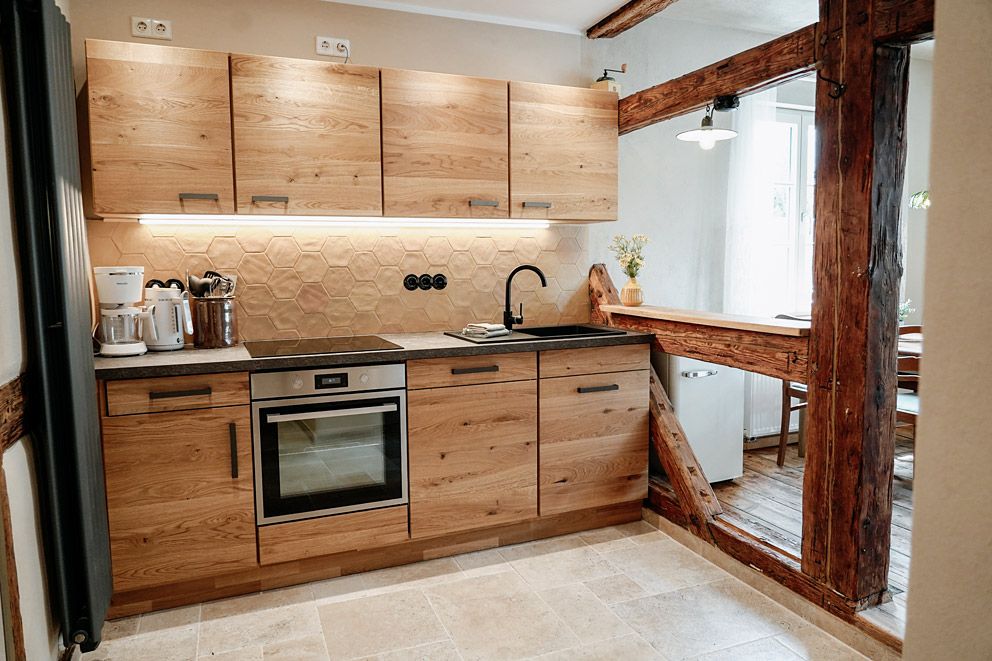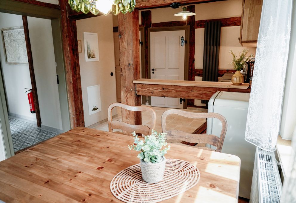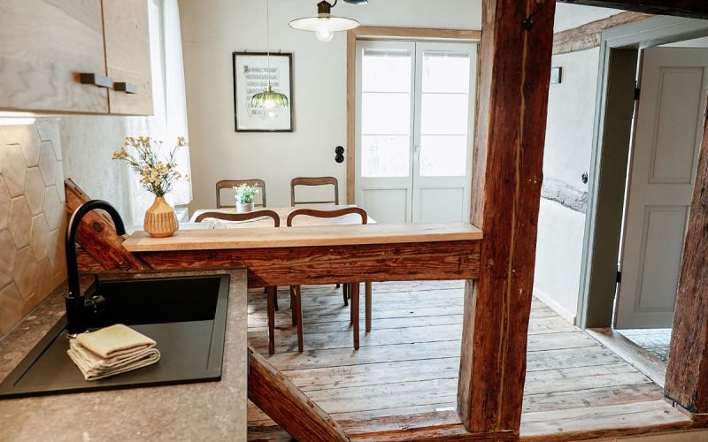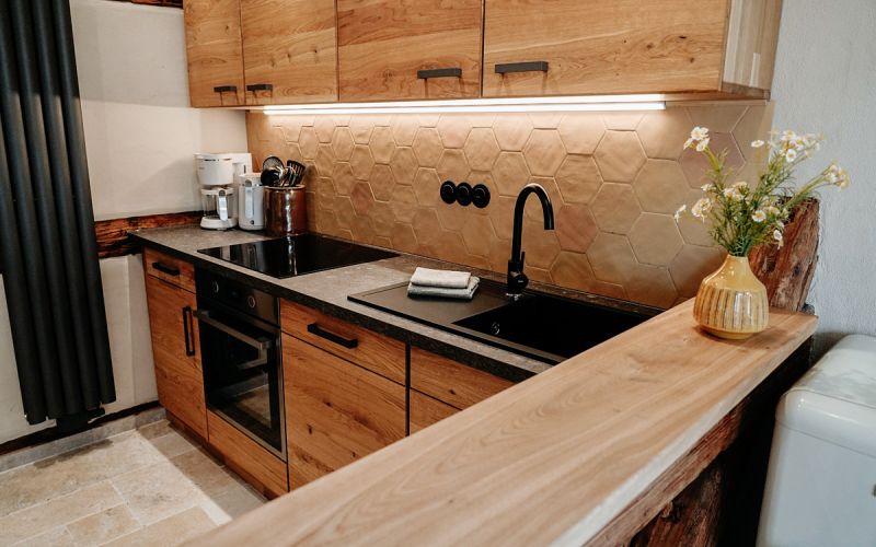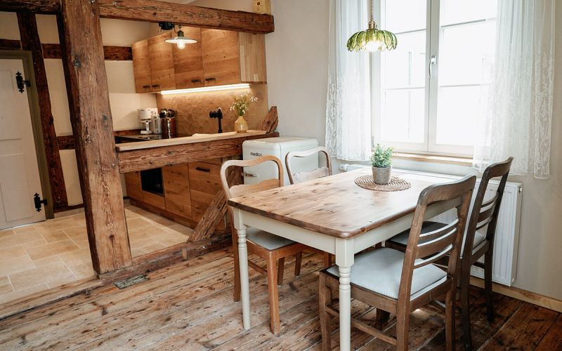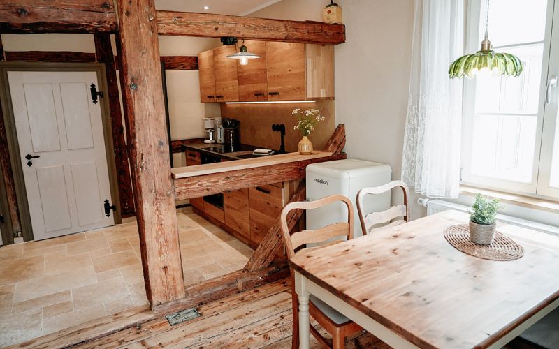 Der Wohnraum, ausgestattet mit rustikalem Holz und einer modernen, separaten Küche, wurde mit viel Liebe zum Detail in eine gemütliche Ferienwohnung verwandelt.