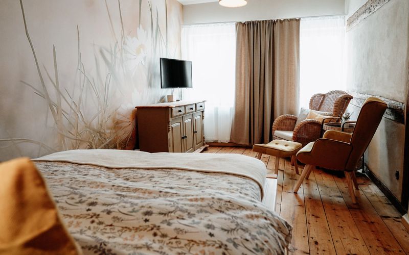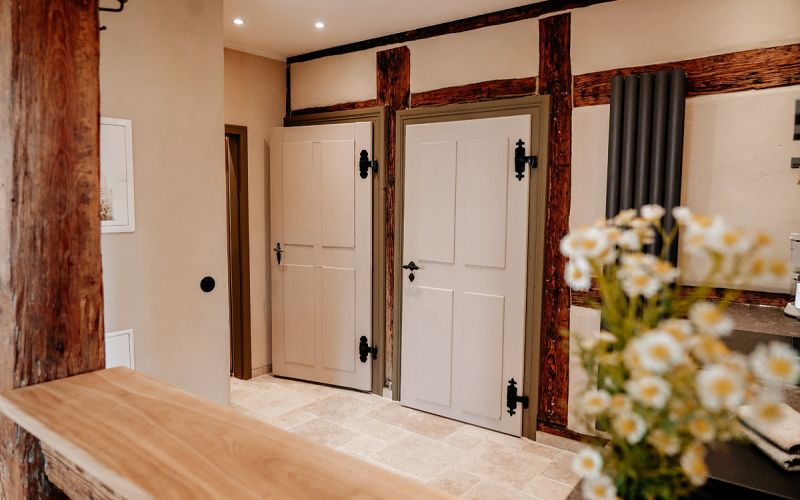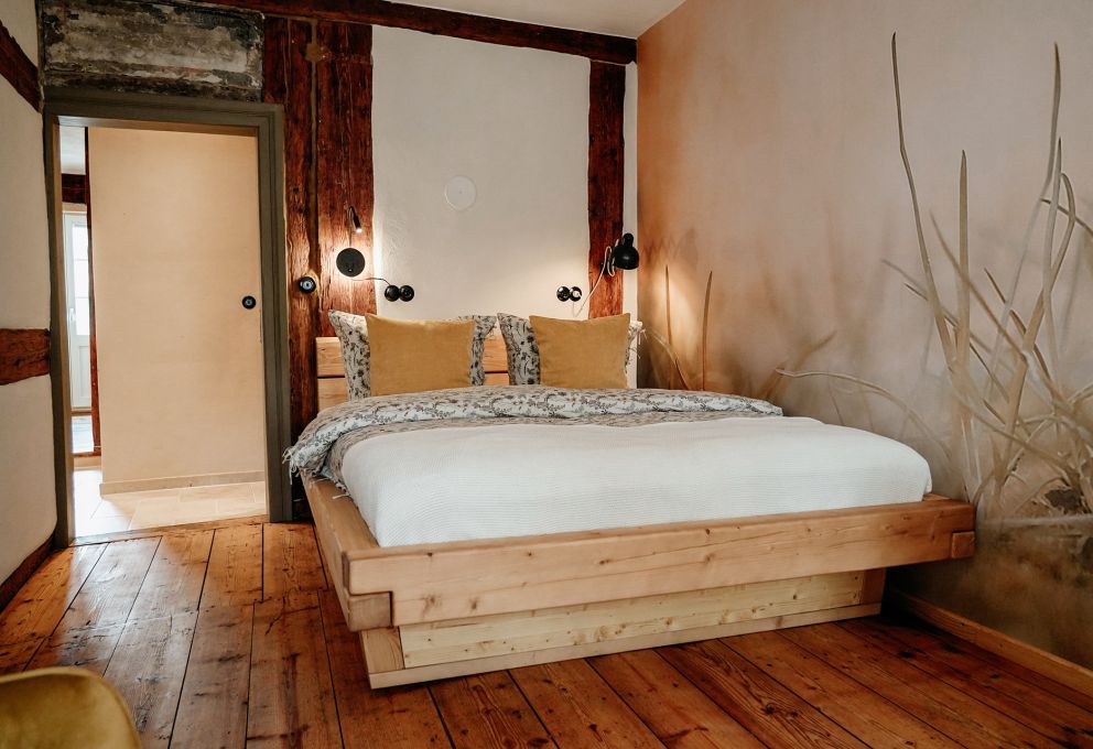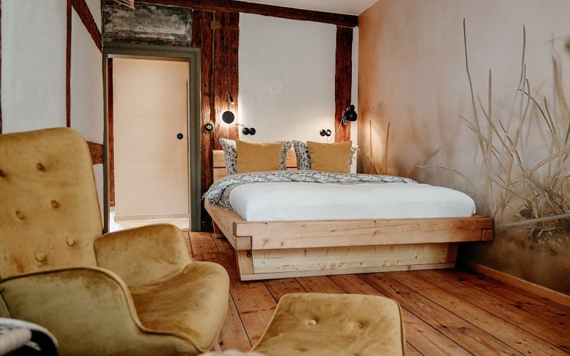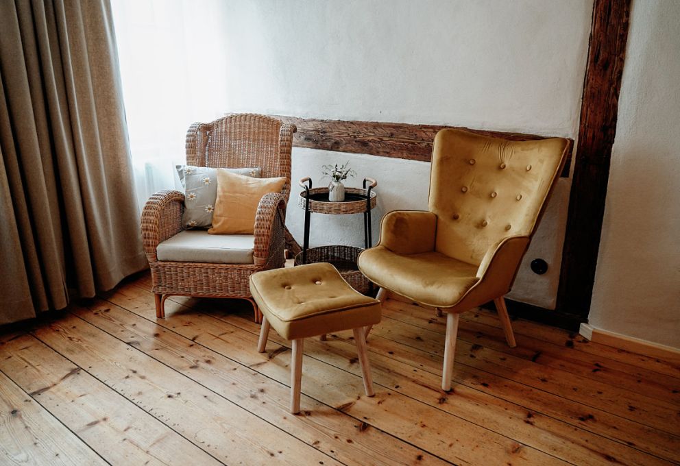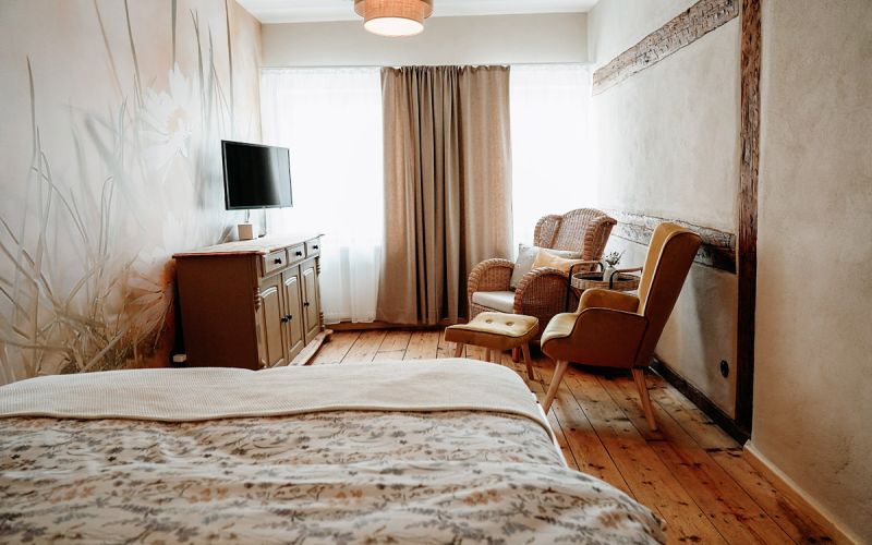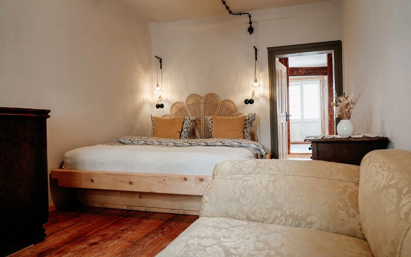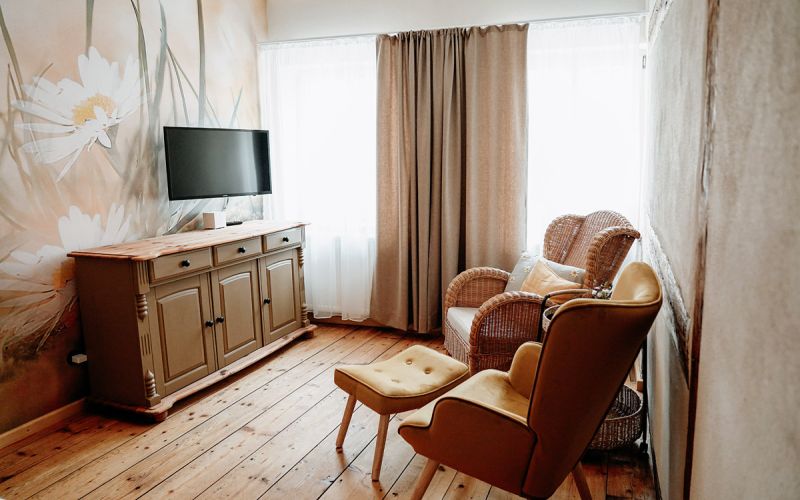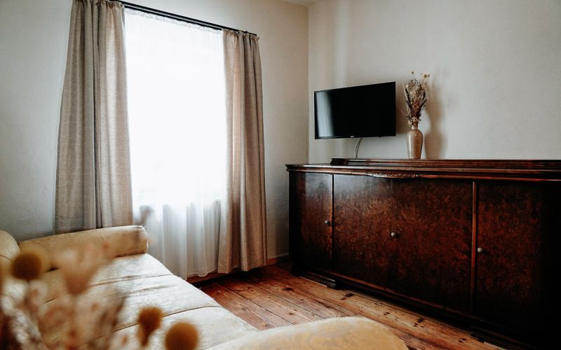 Der Wohnraum, ausgestattet mit rustikalem Holz und einer modernen, separaten Küche, wurde mit viel Liebe zum Detail in eine gemütliche Ferienwohnung verwandelt.