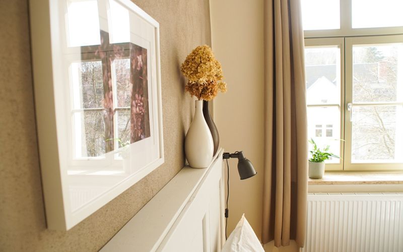 Der große helle Wohnraum mit Küche ist durch alte Fabrikbesonderheiten und Moderne liebevoll zur Ferienwohnung neu auferlebt.