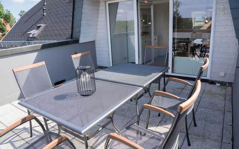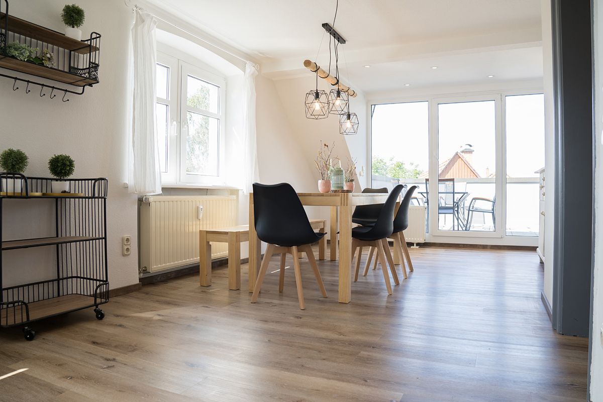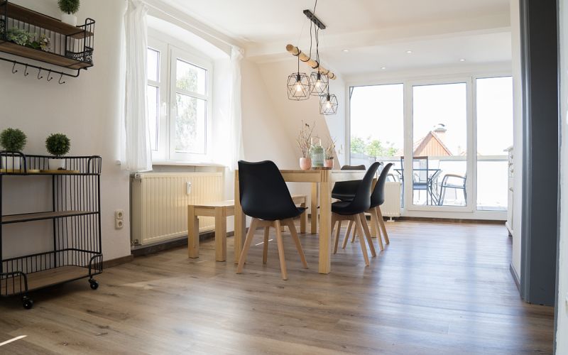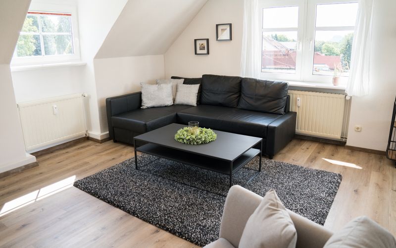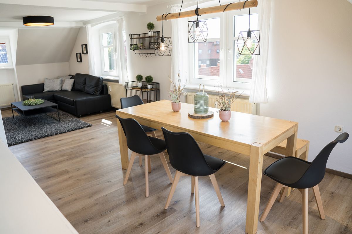 Das große, gemütliche Wohnzimmer ist mit einem großen Ecksofa, einem langen Esstisch mit Bank und 4 Stühlen sowie Sesseln ausgestattet.