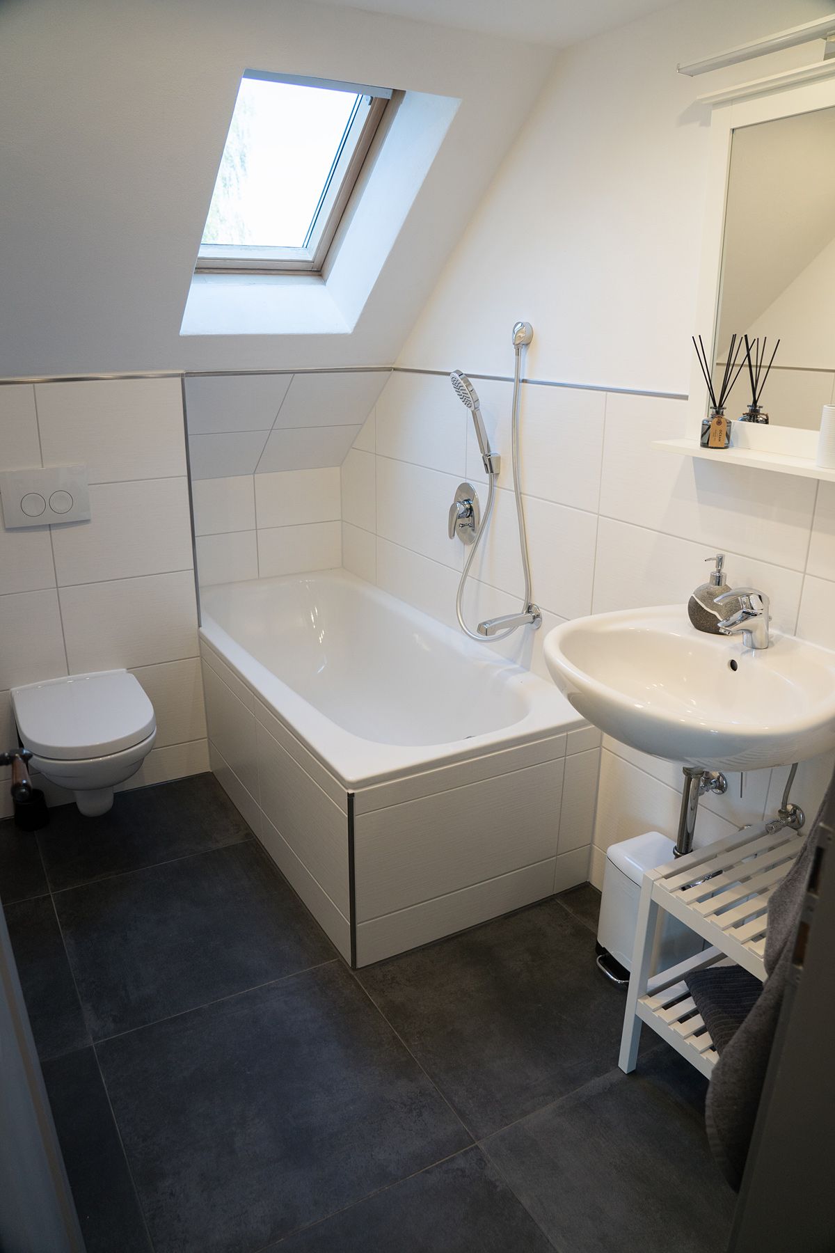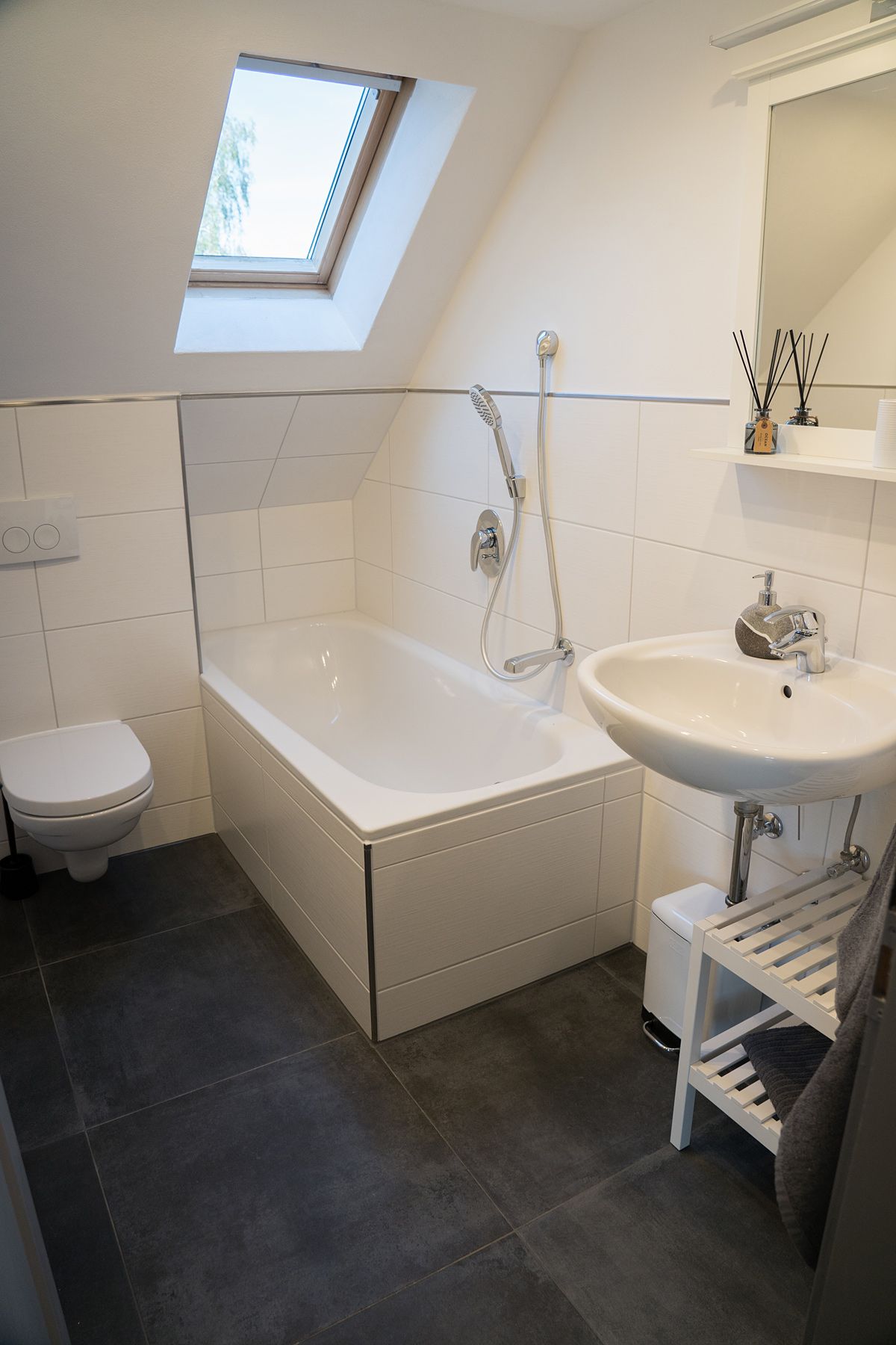 Zwei Bäder stehen mit Dusche und Badewanne, WC und Waschbecken für Sie bereit.