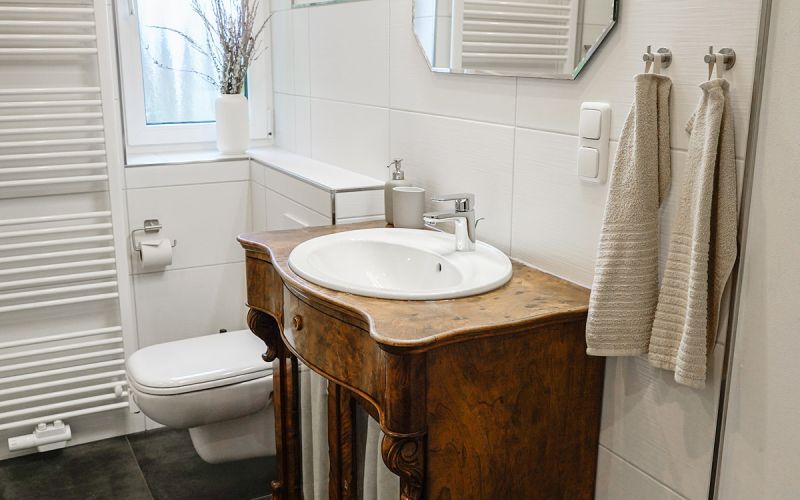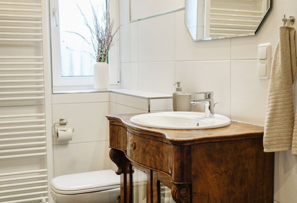 Ein neu saniertes Bad steht, mit Dusche, WC und Waschbecken, für Sie bereit.