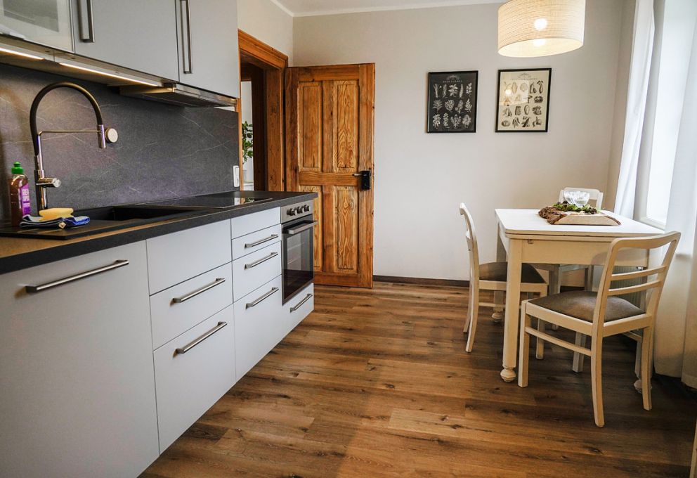 Die neu eingerichtete Küche befindet sich in einem Extraraum und ist vollständig ausgestattet.