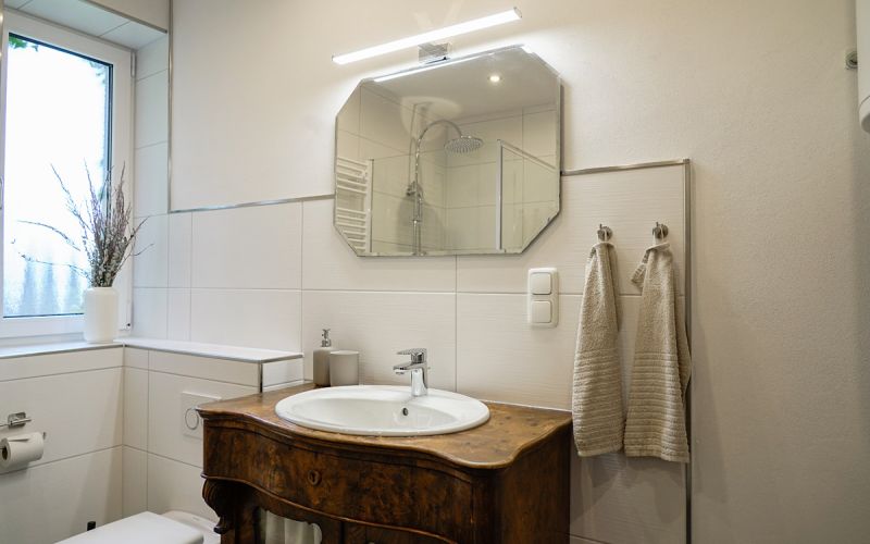 Ein neu saniertes Bad steht, mit Dusche, WC und Waschbecken, für Sie bereit.
